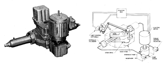 Operating from any standard single or three phase electricity supply. Employing a certified electric motor driving an integral hydraulic pump. The unit can be supplied with integral motor starter incorporating control transformer and local control all housed in an explosion proof enclosed. Torque and speed control are incorporated in the Hydraulic Circuit which is essentially the same as the L TP/H unit. Again by the addition of a hydro-pneumatic accumulator a fail-safe action can be incorporated.