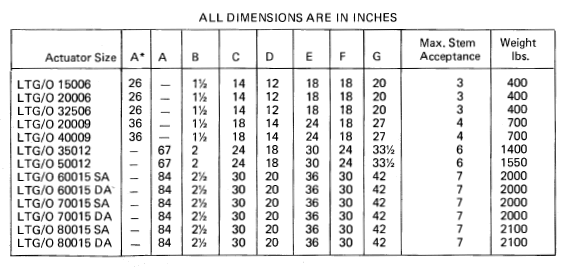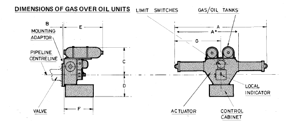 The torque output of this type of actuator varies with the line pressure available as does the torque requirement of the main line valve. In all other respects the gas/oil units are identical to the previously described units and all accessories such as limit switches, limit valves etc. can be applied.