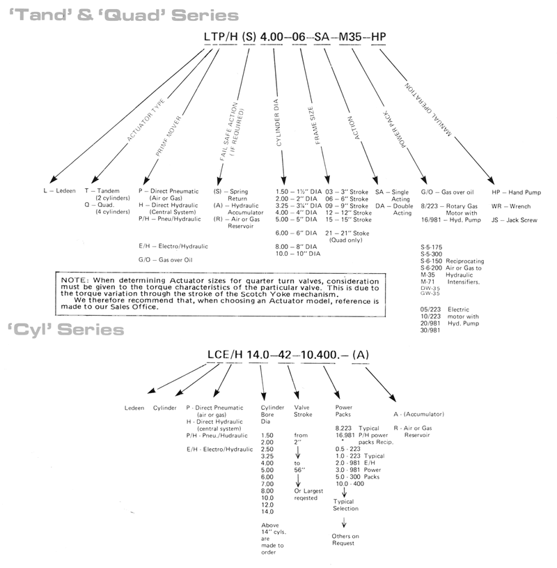The charts shown below illustrate the model numbering system. The first 3 or 4 letters describe the type of actuator and the operating system. This is arrived at by referring to the description of the individual products. The second group of numbers represent the size of actuator unit, its cylinder diameter and scotch yoke characteristics.